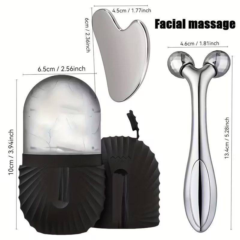 ✔️ Roller liftingujący 3D – długość 13,4 cm, szerokość 4,6 cm✔️ Płytka gua sha ze stali nierdzewnej – dostępne dwa rozmiary: 8,5 × 5,5 cm oraz 6 × 4,5 cm✔️ Forma do masażu lodem (Ice Face Ball) – wysokość 10 cm, szerokość 6,5 cm, silikonowa powłoka ułatwiająca użytkowanie
