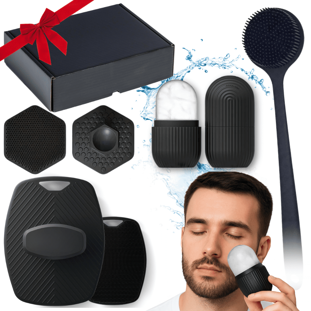 Zestaw prezentowy CZARNY dla mężczyzny – myjka do ciała + myjka do twarzy + Ice Roller + szczotka do pleców