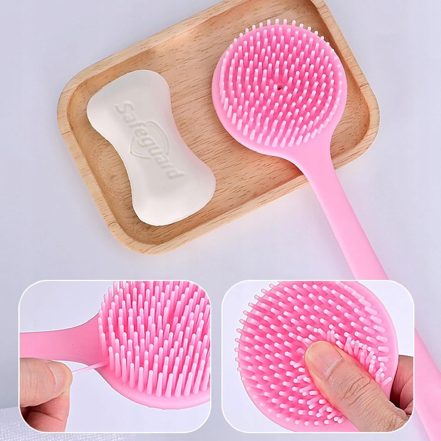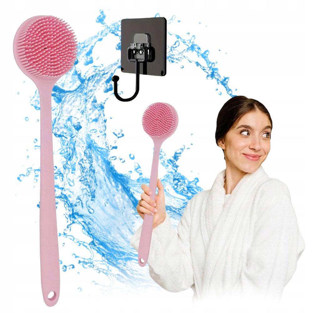 Miękka silikonowa szczotka do pleców z długim uchwytem, BPA-free, hipoalergiczna – różowa + haczyk w zestawie gratis!